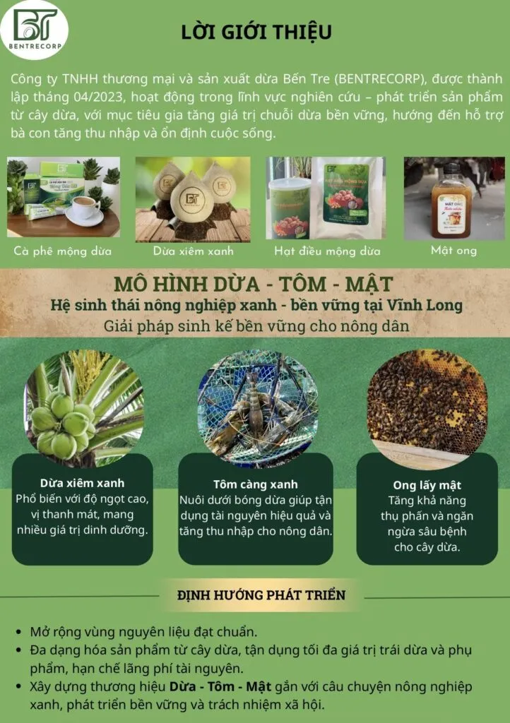 Với tiêu chí tăng giá trị chuỗi phát triển cây dừa, vừa qua được sự chỉ đạo và định hướng của lãnh đạo Tỉnh Bến Tre, Doanh nghiệp “ BENTRECORP” được thành lập và tập trung nghiên cứu phát triển các sản phẩm liên quan đến cây dừa là sản phẩm chủ lực của Tỉnh.