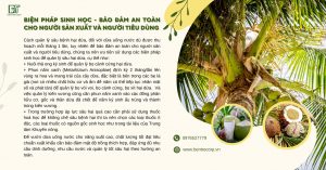+ Trong trường hợp áp lực sâu hại quá cao cần phải sử dụng thuốc hoá học để khống chế sâu bệnh hại thì nên chọn các loại thuốc ít độc, các loại thuốc có nguồn gốc sinh học như Bactericides (Vi sinh vật), Trichoderma, Neem Oil (Dầu neem), Pyrethrum,….Tham khảo thêm trong tài liệu của Trung tâm Khuyến nông.